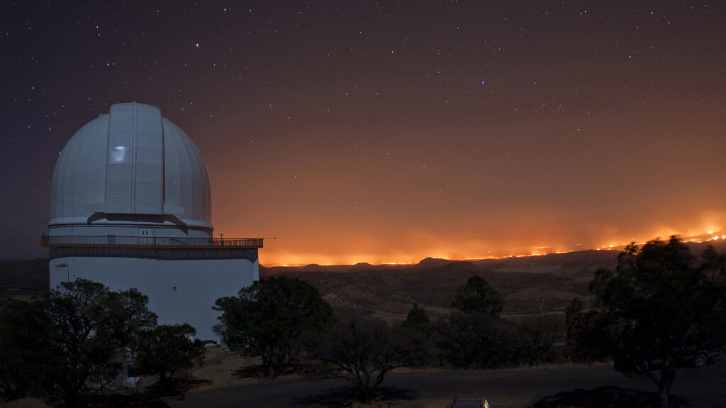 Rock House wildfire, April 2011, in the background of thr Harlan J. Smith Telescope (Credit: Frank Cianciolo/McDonald Observatory)