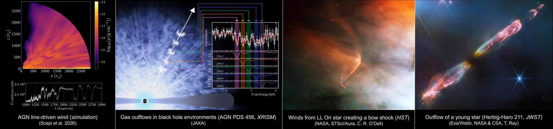 Objectives: The complexity of the data has highlighted the need for coordinated, multi-wavelength approaches that bring observers and theorists into closer collaboration. Building on French expertise across AT-PS, -PEM, -CG, and -PCMI (that are supporting this session), this workshop will foster such cross-community efforts. Presentations of state-of-the-art multi-wavelength observations, theory and modelling of winds across the stellar lifecycle – from birth (young stellar objects and protoplanetary discs), through main-sequence and binary evolution, to endpoints (XRBs) – and on to AGNs will be given. Our goal is to understand how mass, momentum and metals are launched, transported and recycled, and how these processes shape planetary formation processes, large-scale structures, and galaxy evolution.