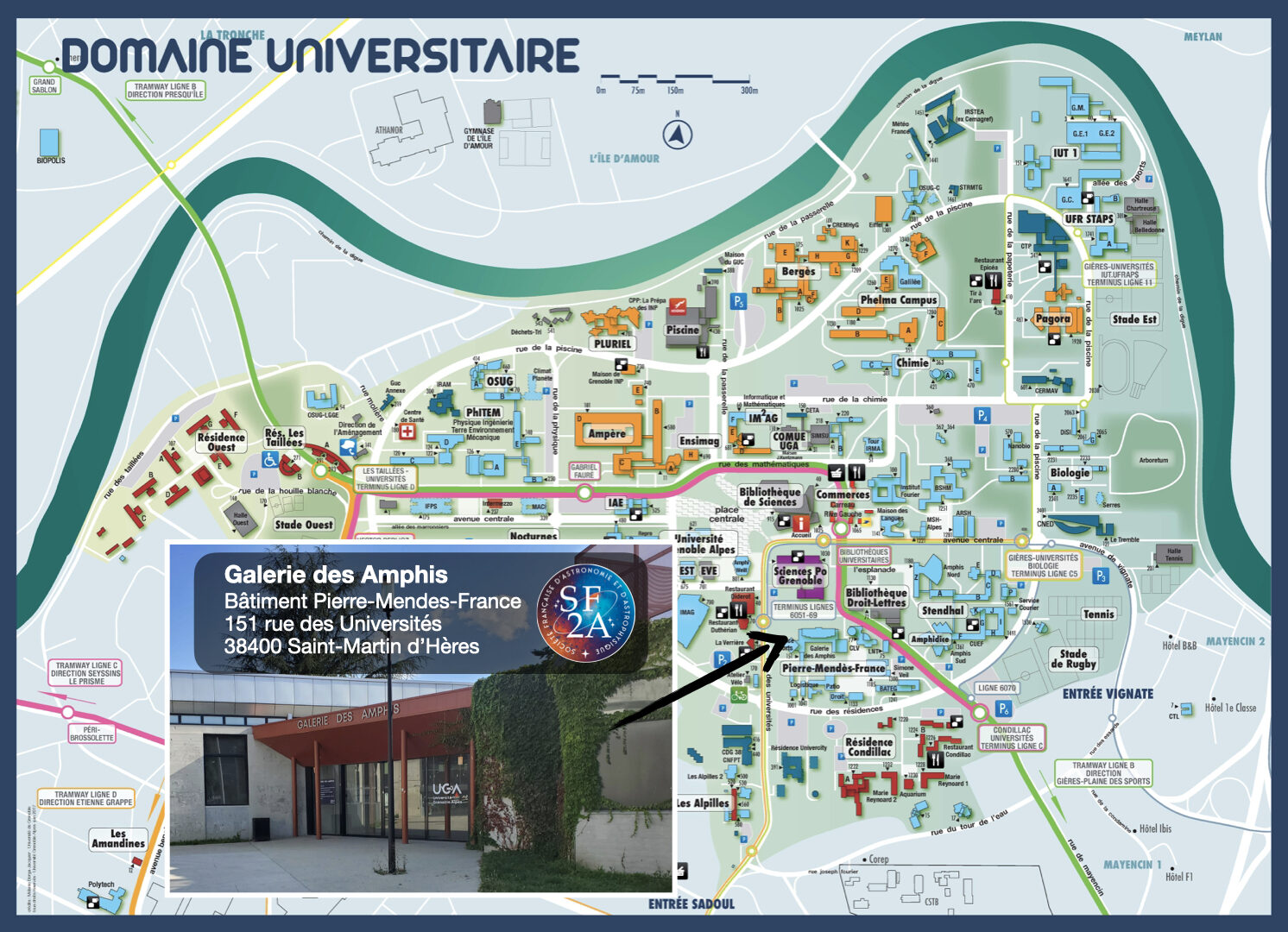 The lecture halls at Grenoble-Alpes University (UGA) are subject to Vigipirate regulations, which impose strict access controls at the entrance to the building, including possible searches that may result in some waiting time. We recommend that participants arrive at the entrance at least 25 minutes before the start of the presentations.